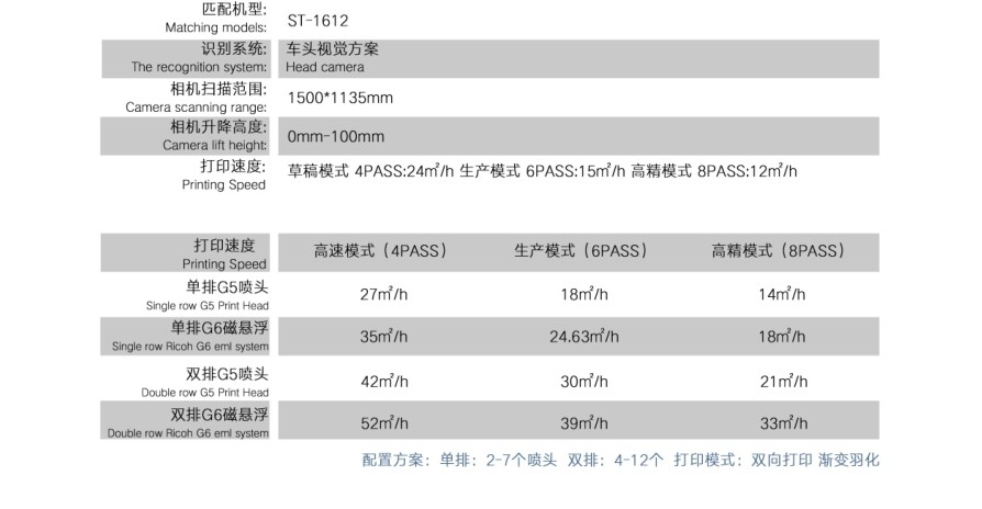 磁懸浮理光G6配置:草稿模式 4PASS:60/h 生產模式6PASS:45/h 高精模式 8PASS:30/h