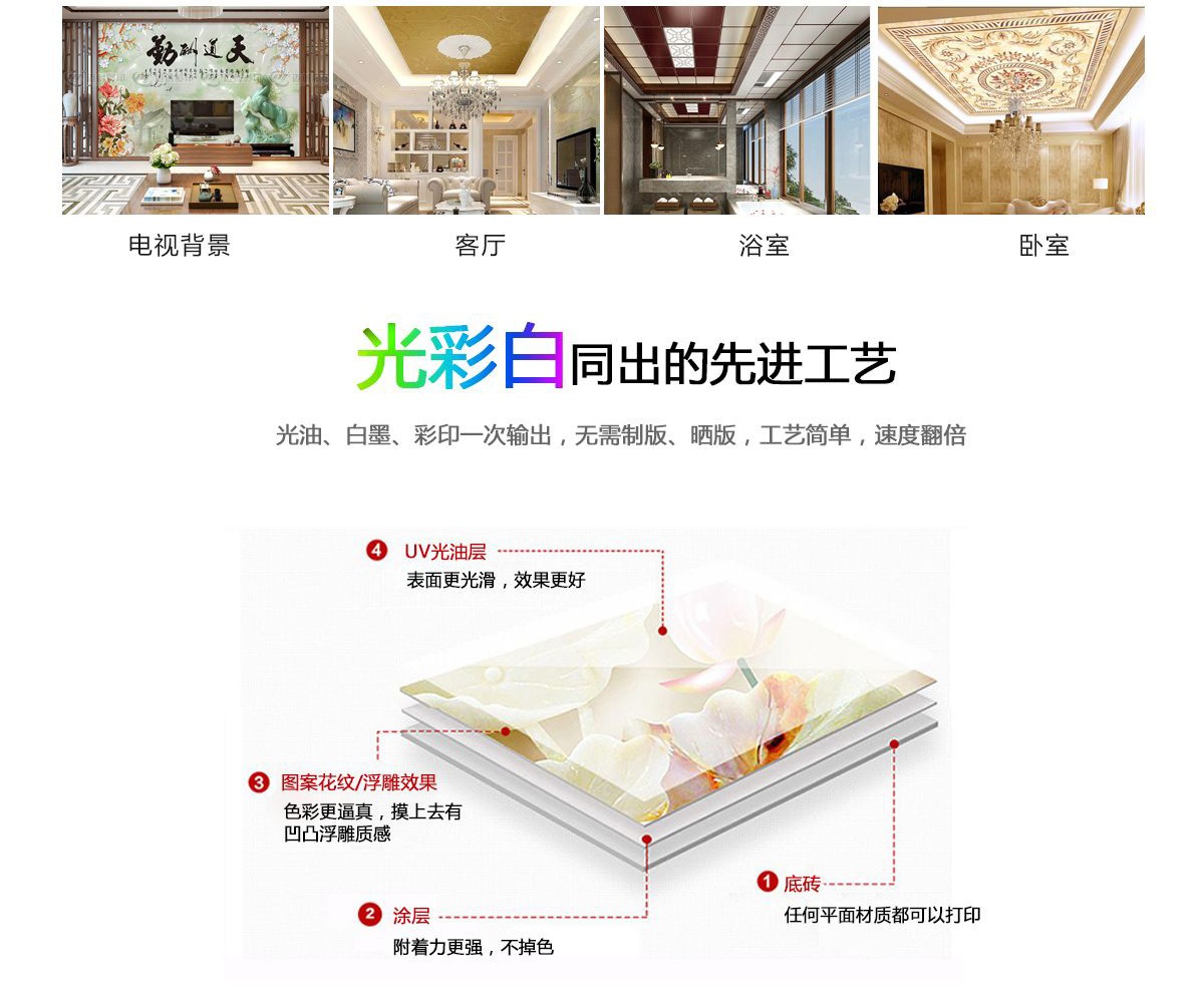 在裝飾行業(yè)UV打印機的作用也是同等重要。UV打印機不需要排版,只需要把需要打印的圖片轉(zhuǎn)到電腦軟件,即可進行打印工作,節(jié)省了時間與人力,UV打印機適用于背景墻、玻璃移門、瓷磚、地毯、幕墻、 隔斷 、天花板、木板、 有機玻璃板等平面材質(zhì)的噴繪。摒棄傳統(tǒng)單一,運用個性構(gòu)思、先進的打印工藝,滿足對藝術(shù)的所有渴望。